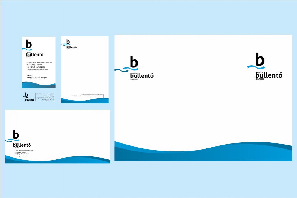 Per a Riegos Bullentó li hem dissenyat aquest nou logo destacant la seua senzillesa. També hem dissenyat tota la seua papereria: Targetes de visita, cartes, quartilles, sobres, carpetes, cunyos, la firma de correu electrònic i els rètols exteriors.