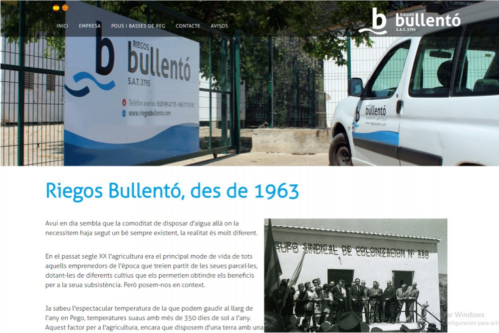 Disseny web i programació d'aquesta pàgina de Riegos Bullentó. Amb un panell d'incidències per avisar per correu electrònic als clients en cas que passe alguna averia o altra circumstància.